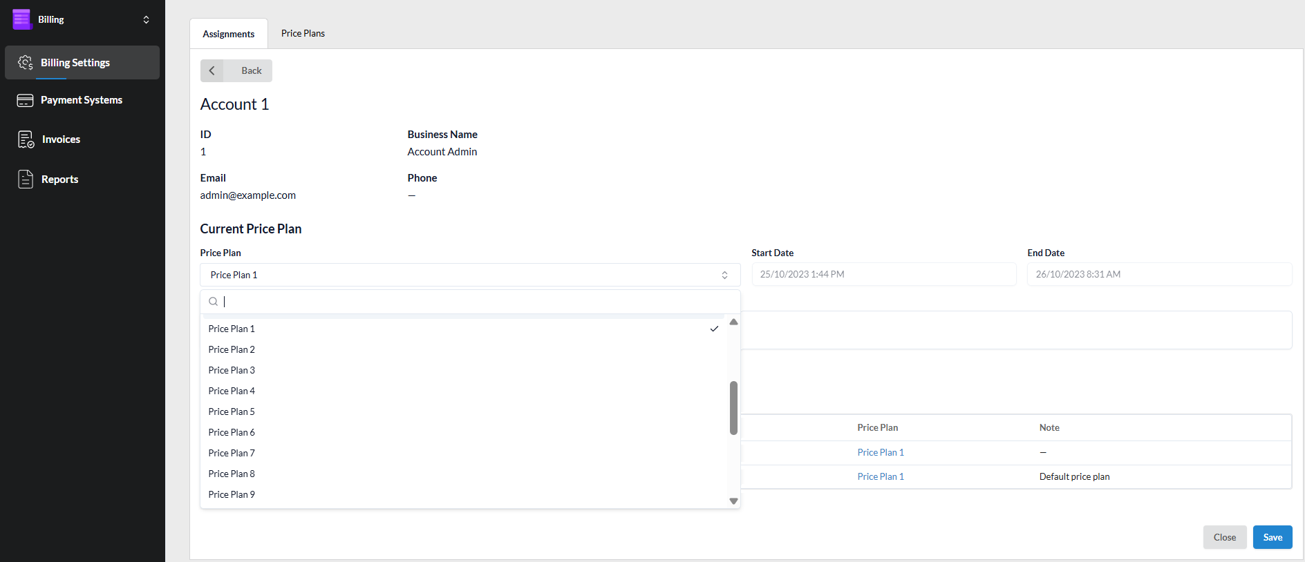 The Billing Settings tab is designed to assign price plans to different accounts.